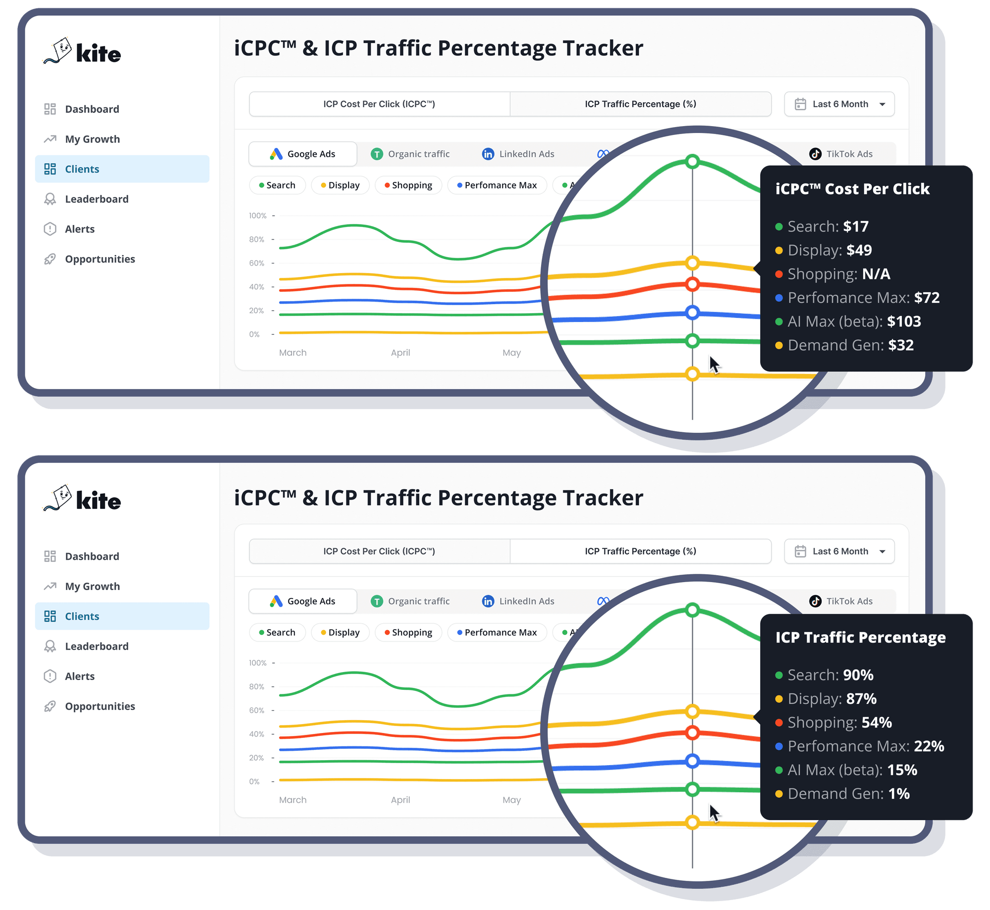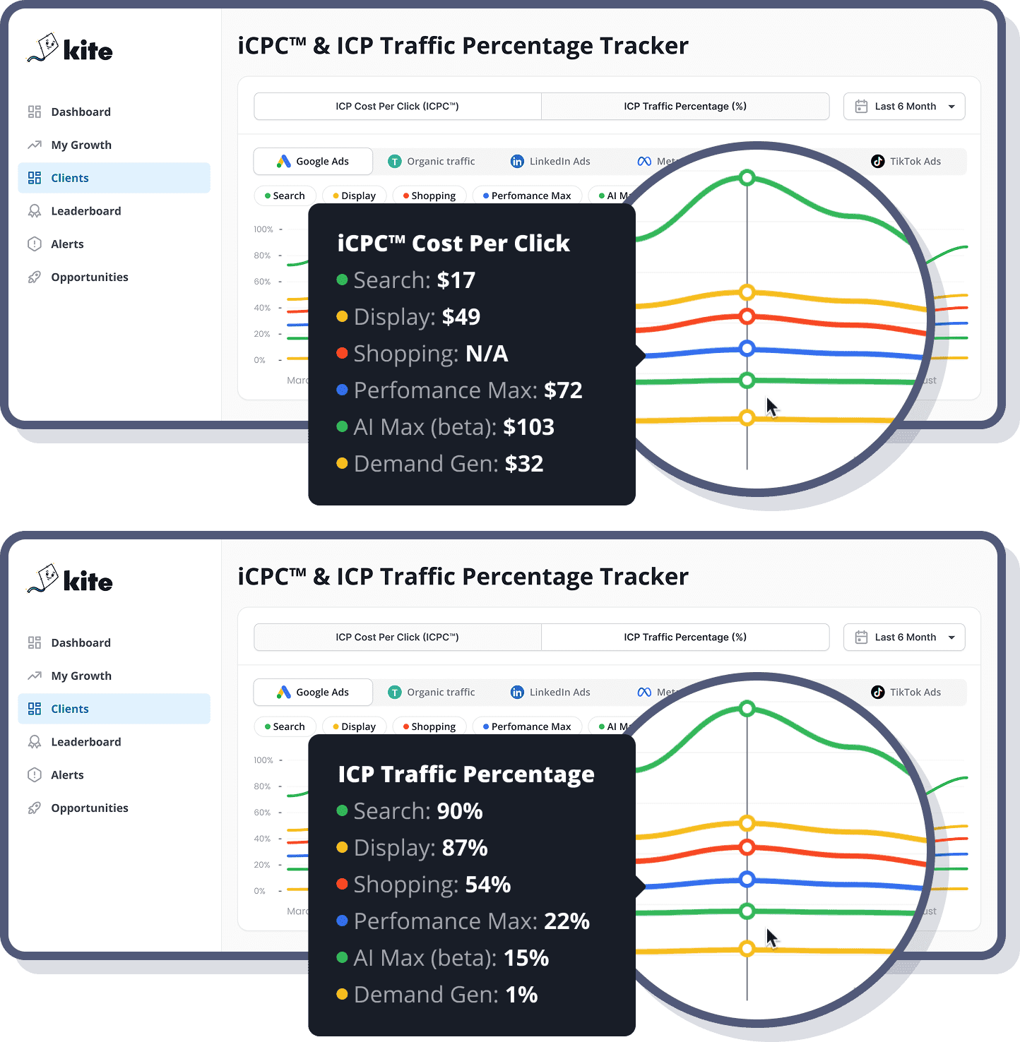 data, Kite calculates your cost per ICP click (iCPC™) & ICP traffic percentages per source, campaign type, & campaign